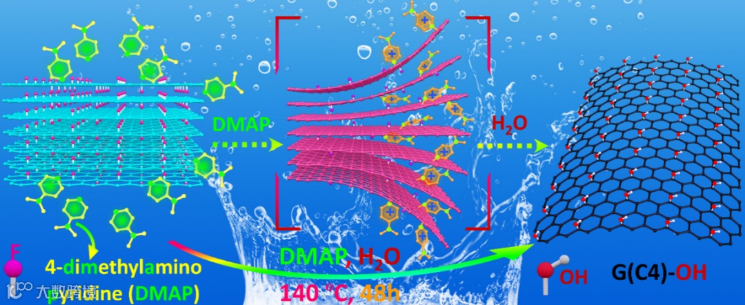 在前期研究基础上(Adv. Funct. Mater. 2019, 1906076; J. Mater. Chem. A 2019, 7, 3353; ACS Appl. Mater. Interfaces 2018, 10, 24679.),并受到有机化学中Morita-Baylis-Hillman反应的启发,最终,我们选用4-二甲氨基吡啶(DMAP)为促进剂,成功促使惰性的氟化石墨原料发生了水解反应,获得了全新的、定义明确的新型氧化石墨烯,其结构简式为G(C4)-OH。