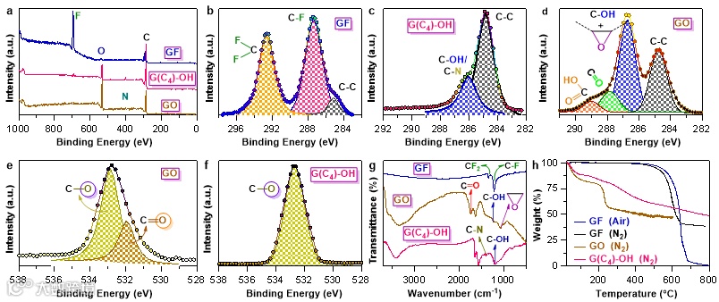 图 2 (a) 氟化石墨原料、G(C4)-OH 和 GO 的XPS全谱图;(b) 氟化石墨的C1s谱图;(c) G(C4)-OH的C1s谱图;(d) GO的C1s谱图;(e) GO的O1s谱图;(f) G(C4)-OH的O1s谱图;(g) 氟化石墨原料、G(C4)-OH 和 GO 的FT-IR谱图;(h)氟化石墨原料、G(C4)-OH 和 GO 的热重分析曲线。