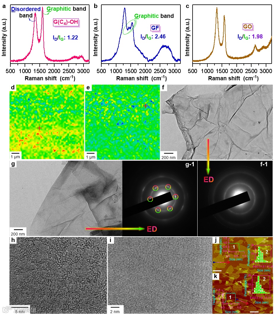 图 3 (a, b, c) 分别为氟化石墨原料、G(C4)-OH 和 GO 的拉曼谱图;(d, e) 分别为G(C4)-OH 和 GO 的二维拉曼Mapping图片;(f) GO的TEM照片;(g) G(C4)-OH的TEM照片;(h) GO的HR-TEM照片;(i) G(C4)-OH的HR-TEM照片;(j) GO的AFM图片;(k) G(C4)-OH的AFM图片。比例尺: 500 nm (插图: 高度图 (1) 和直径分布图(2) );f-1和 g-1: 电子衍射(ED) 模式。
