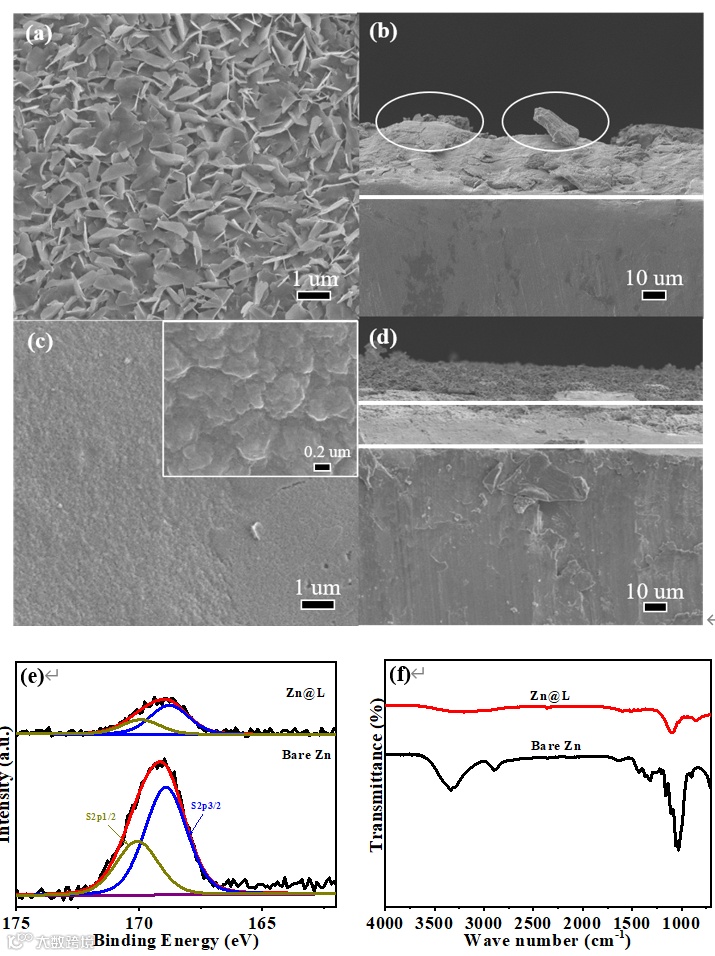 Figure 5. The surface (a and c) and cross-sectional (b and d) SEM images, XPS spectra of S 2p (e), and FTIR spectra (f) of bare Zn (a and b) and Zn@L (c and d) electrodes after 10 cycles at the current density of 2 mA cm-2 with the capacity of 2 mAh cm-2 (Insert is its corresponding high magnification image).