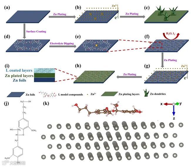 Scheme 1. Schematic diagrams of Zn plating processes on bare Zn (a-c) and Zn@L (d-i) electrodes, the model molecule of L (j) and the corresponding adsorption energy on Zn metal (k).