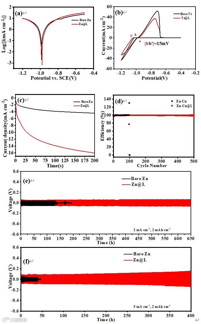 Figure 3. (a) Linear polarization curves of bare Zn and coated Zn, (b) Cyclic voltammetry curves of bare Ti and Ti@L foils, (c) Chronoamperometry curves of bare Zn and Zn@L, (d) Coulombic efficiency curves of Zn-Cu and Zn-Cu@L cells, and the galvanostatic cycling of symmetrical bare Zn and Zn@L cells at the current densities of (e) 2 mA cm−2 and (f) 5 mA cm−2 with the fixed capacity of 2 mAh cm-2.