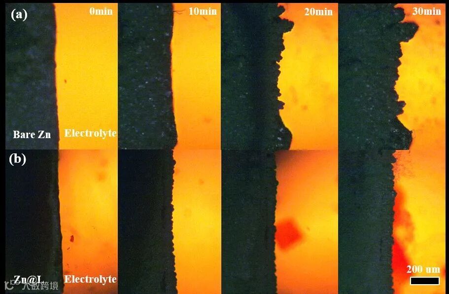 为了探索L涂层对Zn枝晶生长的影响,通过光学显微镜记录不同时间下锌沉积过程。可以看出,裸锌电极表面在30分钟内枝晶生长明显,Zn@L电极表面无枝晶产生。