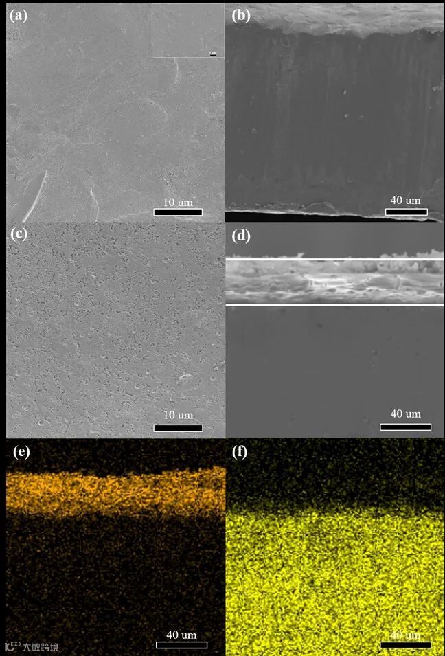 Figure 1. The surface and cross-sectional SEM images of bare Zn (a and b) and Zn@L (c and d) and the corresponding C (e) and Zn (f) element mapping images of Zn@L.