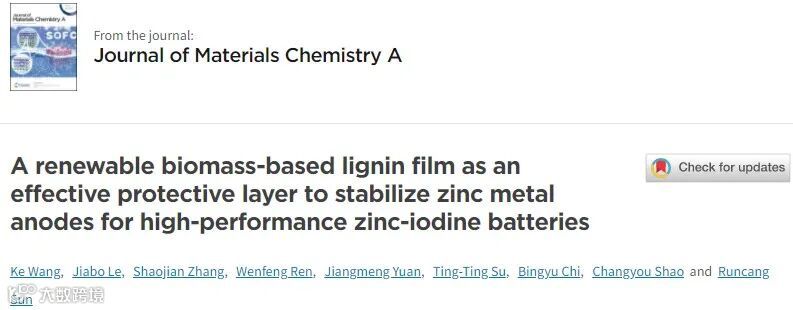大连工业大学孙润仓教授、任文锋副教授JMCA:可再生生物质基木质素保护膜用于稳定高性能锌碘电池锌金属负极 科学材料站