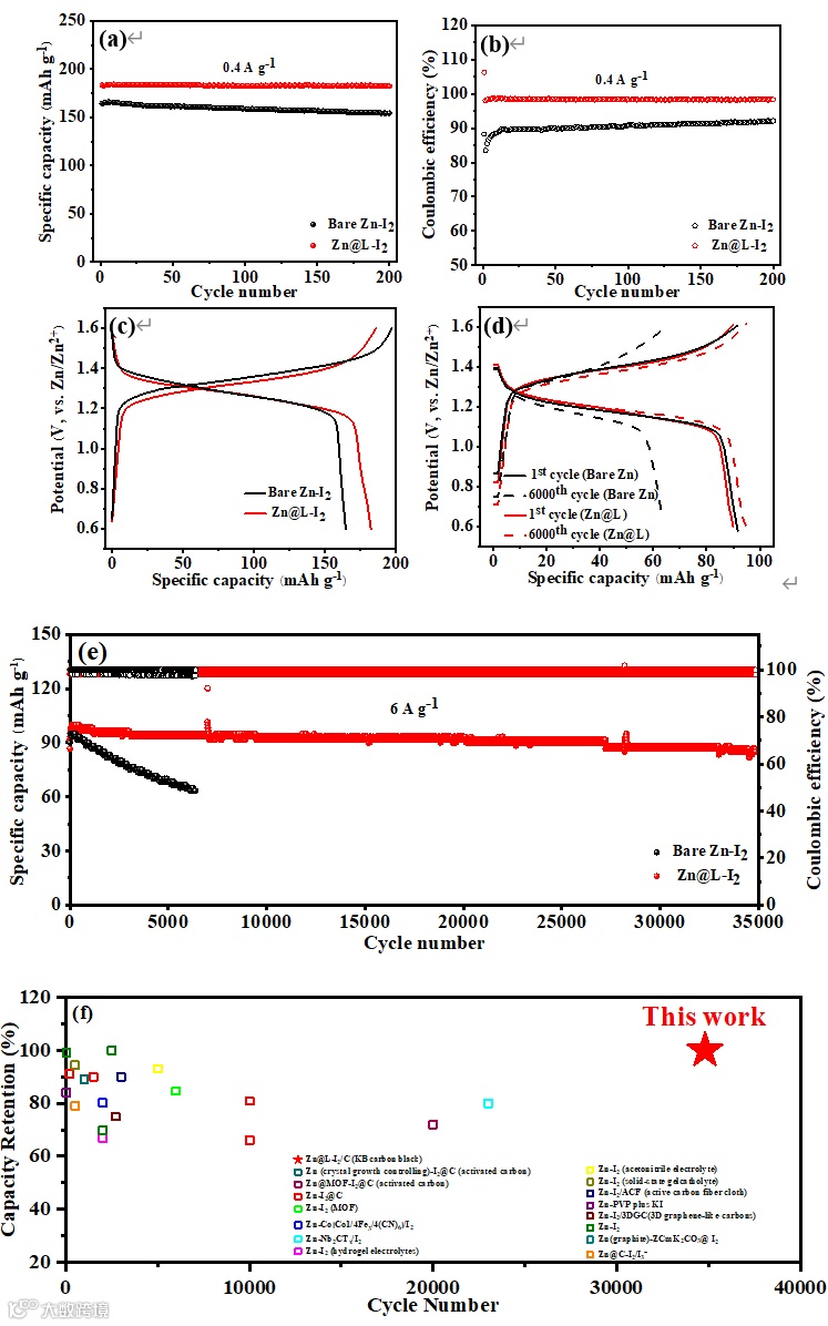 由于保护层优异的结构,锌碘全电池展现出了优异的电化学性能。在0.4 A g-1的电流密度下,其可逆容量可达183.3mAh g-1(98.4%的库伦效率);即使在6 A g-1的大电流密度下,35000次循环后,依然能表现出86.7 mAh g-1的可逆容量和99.7%的高容量保持率。