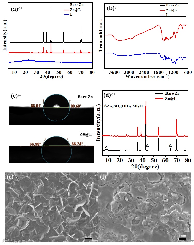 Figure 2. XRD patterns (a) and FTIR spectra (b) of L, bare Zn, and Zn@L, contact angles (c) of ZnSO4 electrolyte on the surface of bare Zn and Zn@L, XRD patterns (d) and the corresponding SEM images of bare Zn (e) and Zn@L (f) after dipping in ZnSO4 electrolyte for 7 days.