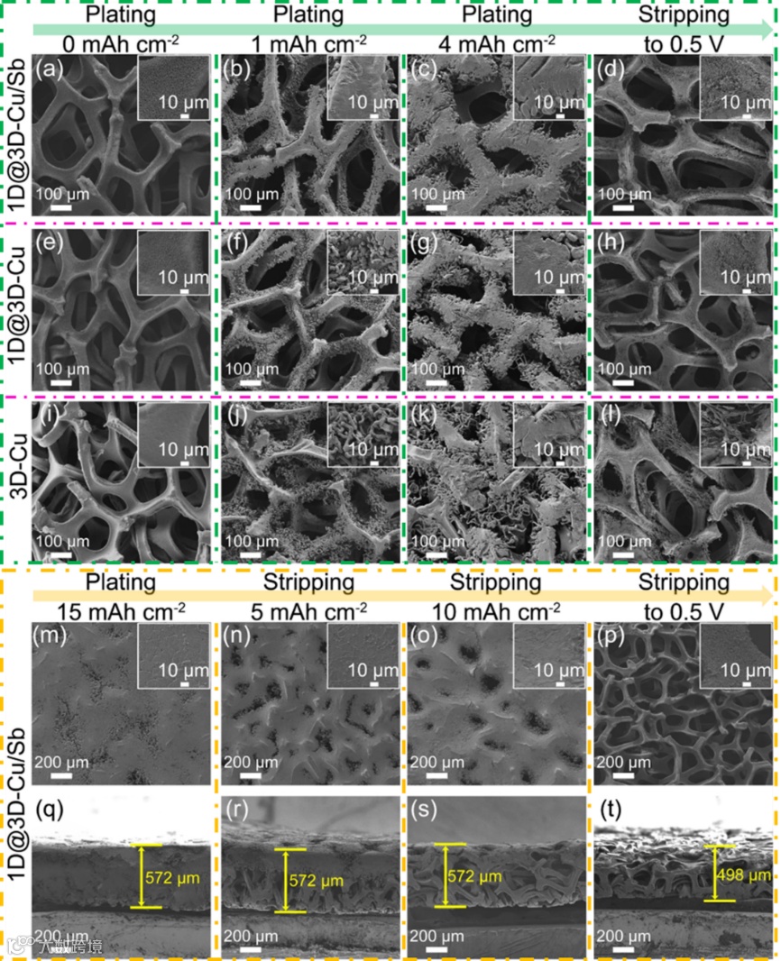 通过非原位SEM表征锂在各种3D集流体上的沉积/剥离行为可以发现,锂均匀的包裹在1D@3D-Cu/Sb骨架上,随着沉积锂的量增加,泡沫铜的孔被填充,呈现光滑平整的表面,没有大量锂枝晶的生长。当锂从集流体上剥离后,发现没有多余的“死锂“,而且电极的厚度没有发生明显的变化。