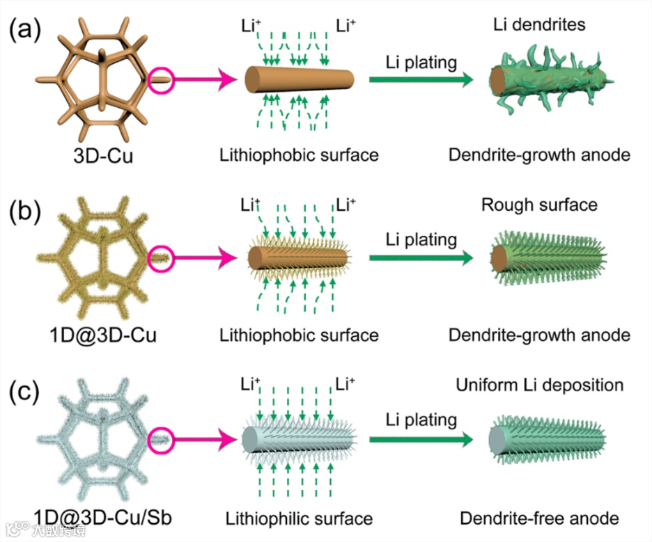图1. 金属锂在3D-Cu、1D@3D-Cu和1D@3D-Cu/Sb上的沉积示意图。