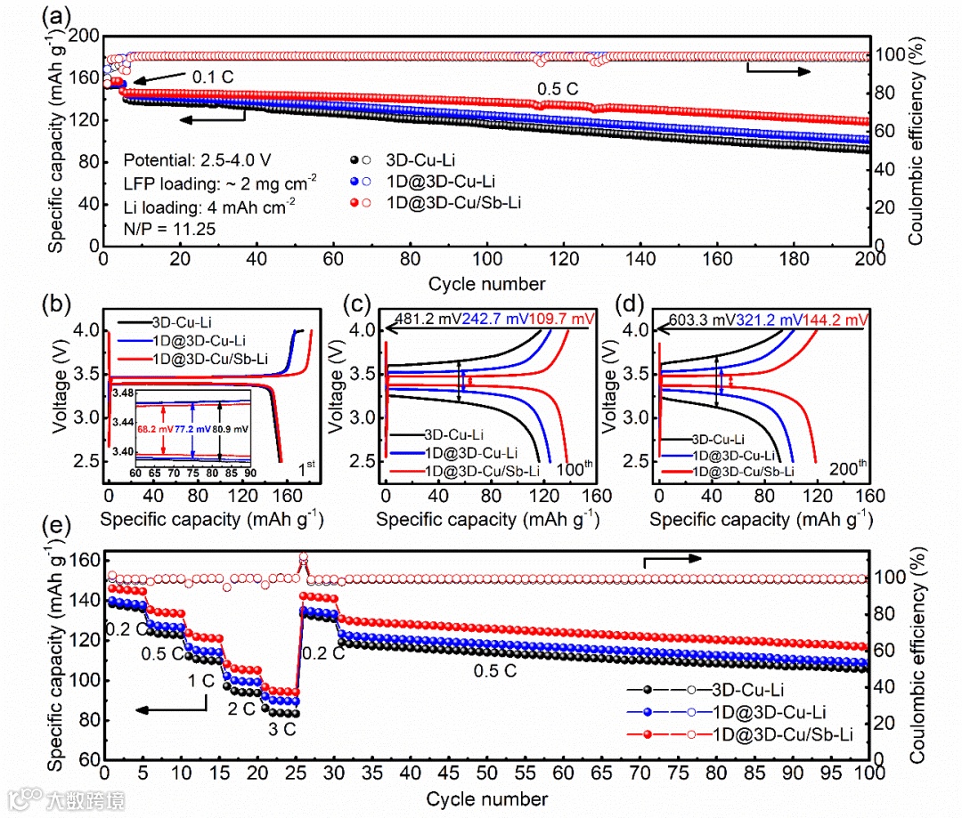 图6. 3D-Cu-Li、1D@3D-Cu-Li和1D@3D-Cu/Sb-Li电极全电池性能图