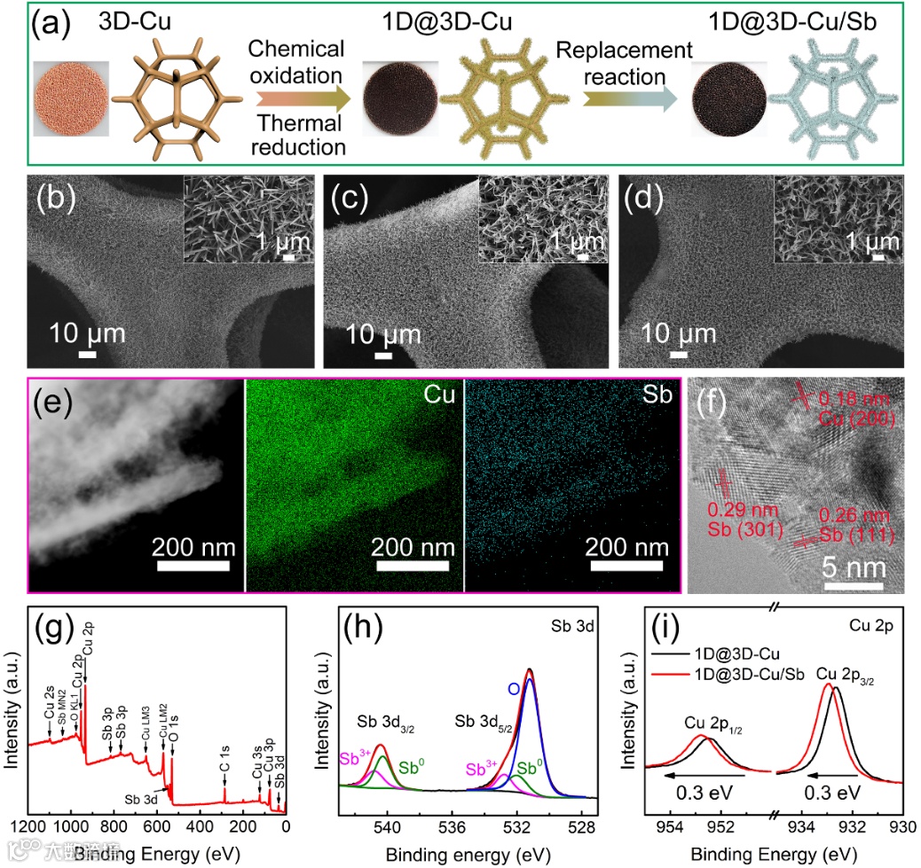 图2. 1D@3D-Cu/Sb集流体的制备和表征。