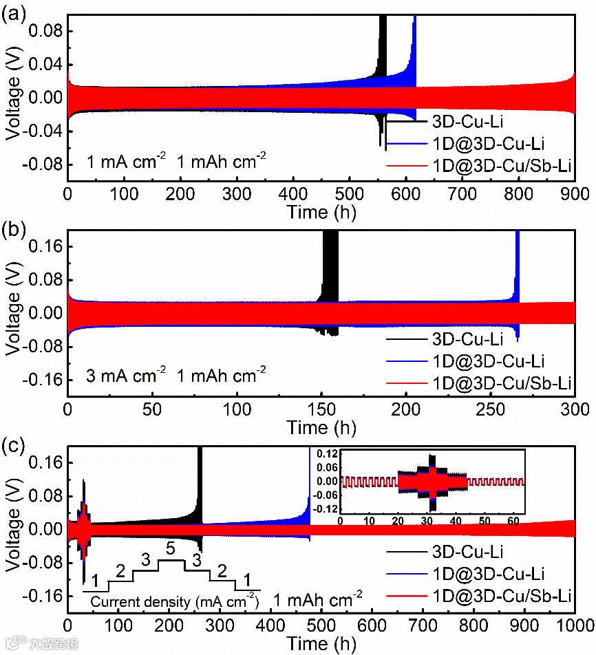 图5. 3D-Cu-Li、1D@3D-Cu-Li和1D@3D-Cu/Sb-Li电极对称电池性能图