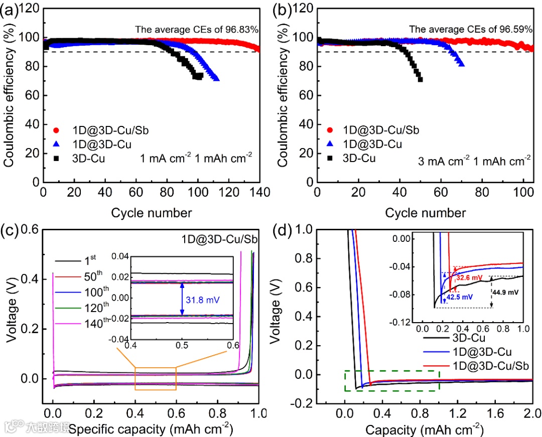 对于1D@3D-Cu/Sb电极,在活化过程后,Sb转变为Li-Sb合金对Li+的吸附能提高、扩散能减小,同时增加了锂的成核位点。因此,Li+在1D@3D-Cu/Sb集流体上的成核过电势减小。1D@3D-Cu/Sb集流体的引入显著提高了半电池的平均库伦效率。