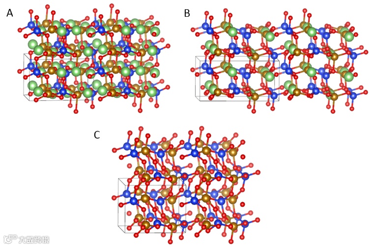 图1. DFT模拟优化计算出的不同放电状态下的团簇结构。A: Li2FeSiO4,B: LiFeSiO4,C: FeSiO4。颜色代码:蓝色-Si、黄色-Fe、绿色-Li和红色-O。