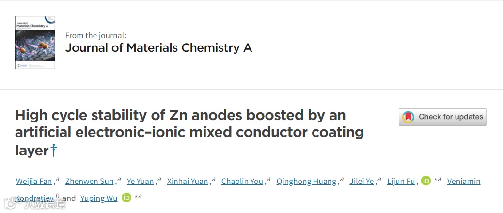 付丽君教授、吴宇平教授, JMCA观点:人工电子-离子混合导体涂层提高锌负极的高循环稳定性 科学材料站