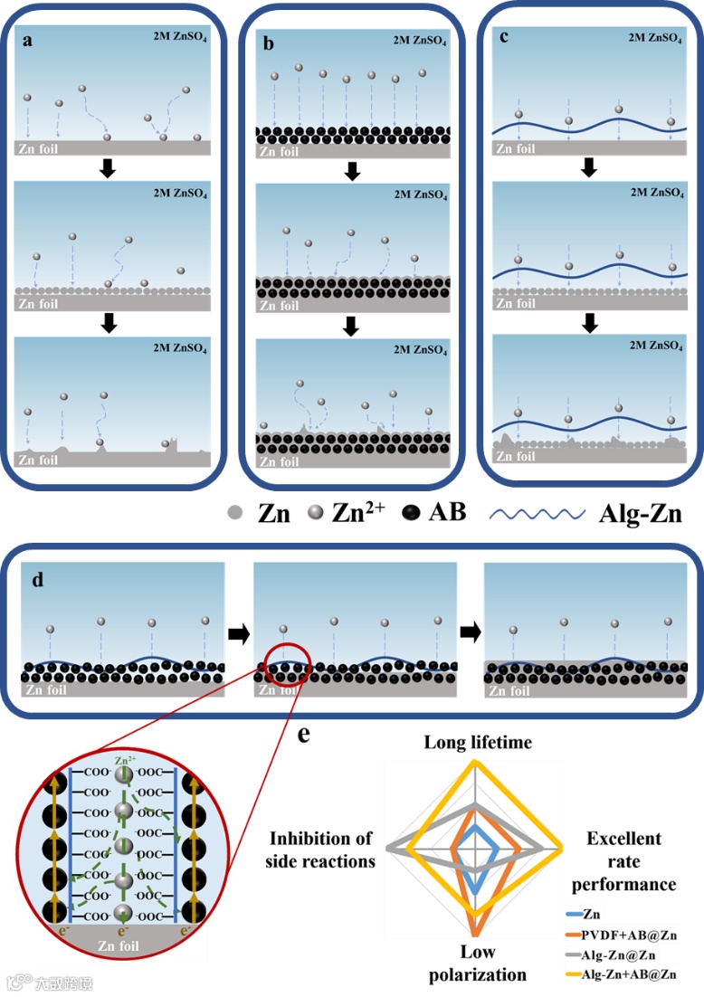 图1. a)Zn、b)PVDF+AB@Zn、c)Alg-Zn@Zn 和d)Alg-Zn+AB@Zn 上的锌沉积示意图。(e )不同负极对称电池的定性比较。