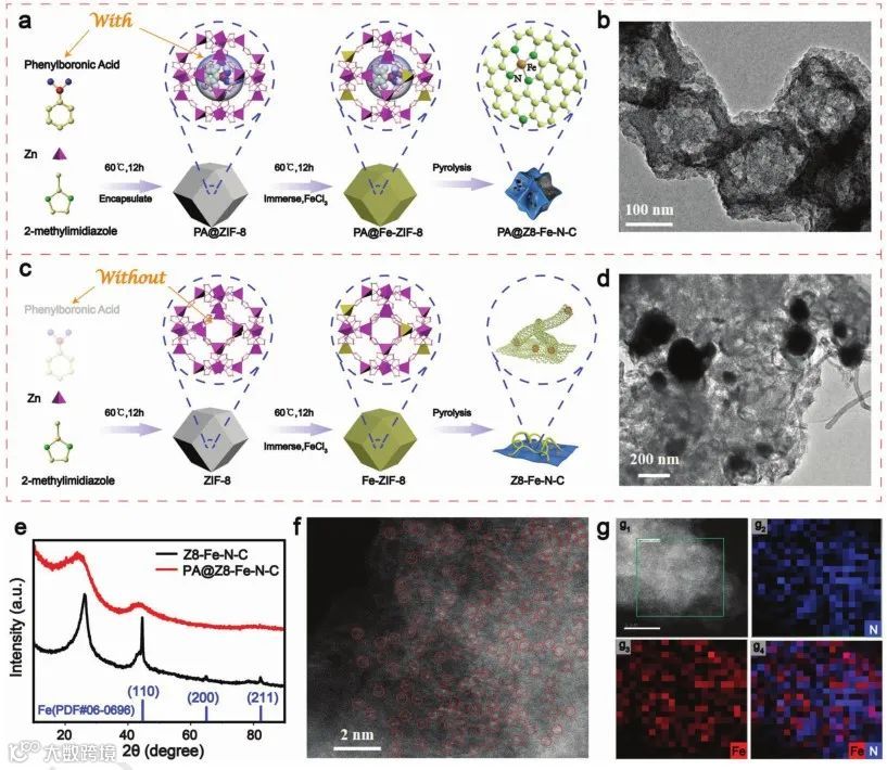 图1. a) PA@Z8-Fe-N-C催化剂合成图, b) PA@Z8-Fe-N-C催化剂的TEM图像(含苯硼酸),c)对比例Z8-Fe-N-C催化剂合成图, d) Z8-Fe-N-C催化剂的TEM图像(不含苯硼酸),e) Z8-Fe-N-C和PA@Z8-Fe-N-C的X射线衍射图,f) PA@Z8-Fe-N-C的AC-HAADF-STEM图像(以红色圆圈突出显示的单个铁原子),g) HAADF-STEM图像和PA@Z8-Fe-N-C的N,Fe和Fe+N元素的EELS mapping图。
