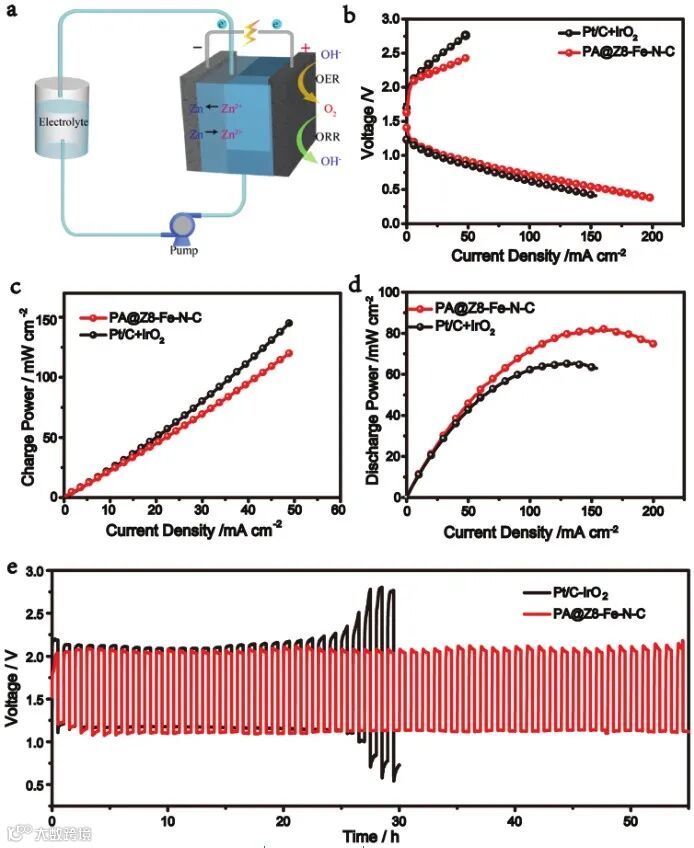 图5 a) 锌-空气液流电池示意图,用PA@Z8-Fe-N-C或者Pt/C+ IrO2作为空气阴极的锌-空气液流电池b) 充放电电压曲线,c) 充电能量,d) 放电能量 和 e) 循环稳定性