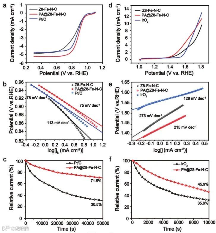 图4 a) ORR极化曲线 and b) 对应的不同催化剂的塔菲尔斜率,c) PA@Z8-Fe-N-C和Pt/C通过计时电流法测试ORR稳定性的比较;d) OER极化曲线 and e) 对应的不同催化剂的塔菲尔斜率,f) PA@Z8-Fe-N-C和IrO2通过计时电流法测试ORR稳定性的比较