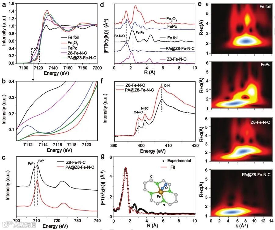 图2. a) Z8-Fe-N-C, PA@Z8-Fe-N-C和对比样Fe箔,FePc和Fe2O3的Fe K-edge XANES图像;b) a图中预边缘区域的放大视图;c) Z8-Fe-N-C和 PA@Z8-Fe-N-C的Fe L-edge XANES图像;d) a图中Fe K-edge EXAFS的傅里叶变换;e) Fe箔,FePc,Z8-Fe-N-C和PA@Z8-Fe-N-C的WT图像;f) Z8-Fe-N-C和 PA@Z8-Fe-N-C的N K-edge XANES图像;g) PA@Z8-Fe-N-C傅里叶变换的实验EXAFS谱及光谱的EXAFS拟合(插图:催化剂中Fe-N/O位点的模型示意图)