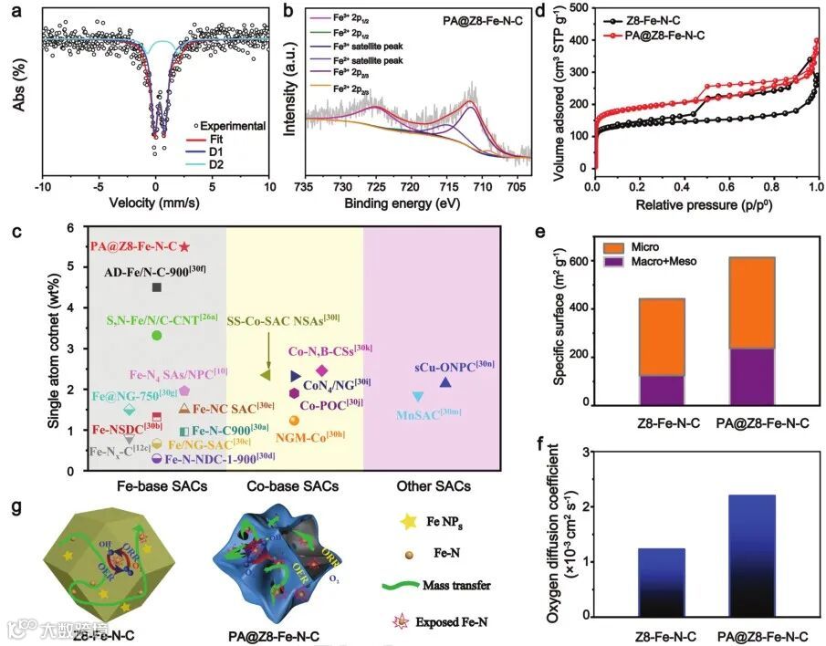 图3. a) Fe穆斯堡尔谱和PA@Z8-Fe-N-C的拟合;b) PA@Z8-Fe-N-C高分辨率Fe 2p XPS光电子能谱;c) 过渡金属基双功能氧催化剂的单原子含量;Z8-Fe-N-C和 PA@Z8-Fe-N-C 的d)N2吸-脱附曲线,e)比表面积,f)氧扩散系数 和g)传质和暴露活性部位的示意图模型