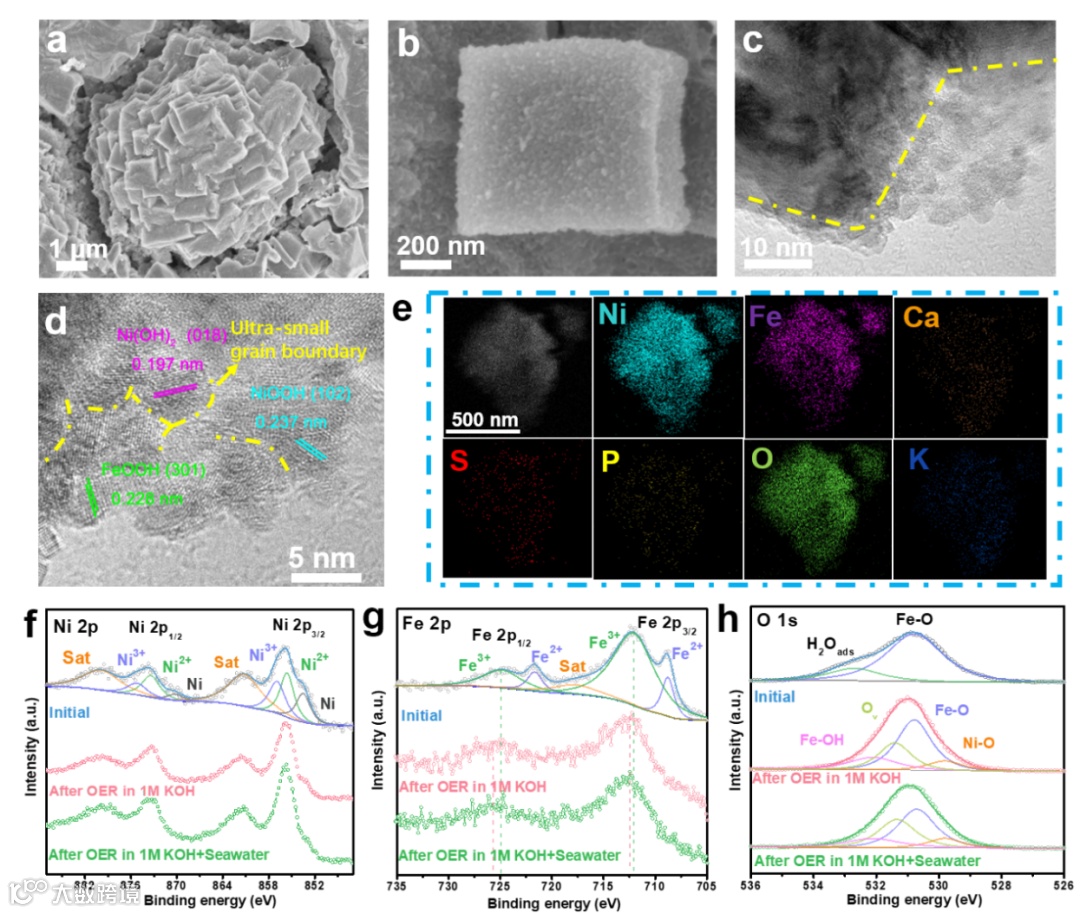 图4. Ni3S2/Fe-NiPx/NF在1M KOH电解液中进行 OER 测试后的 (a, b) FESEM 图像;(c, d)不同放大倍率下的HRTEM 图像。(e) Ni3S2/Fe-NiPx/NF在碱性天然海水中进行 OER 测试后的 STEM 图像和相应的元素分布图。OER 测试前后 Ni3S2/Fe-NiPx/NF的 (f) Ni 2p、(g) Fe 2p 和 (h) O1s 的高分辨率 XPS图谱。