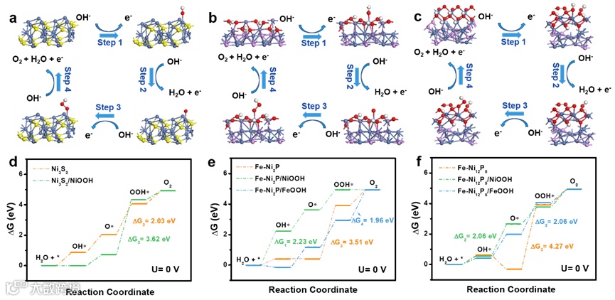 DFT计算结果证实,Fe-Ni2P和Fe-Ni12P5与相应重构物种(FeOOH或NiOOH)的耦合有效调节了OER活性中间产物的吸附自由能,从而降低反应能垒。其中,Fe-Ni2P/FeOOH重构体系作为OER活性中心贡献了大部分的OER活性。