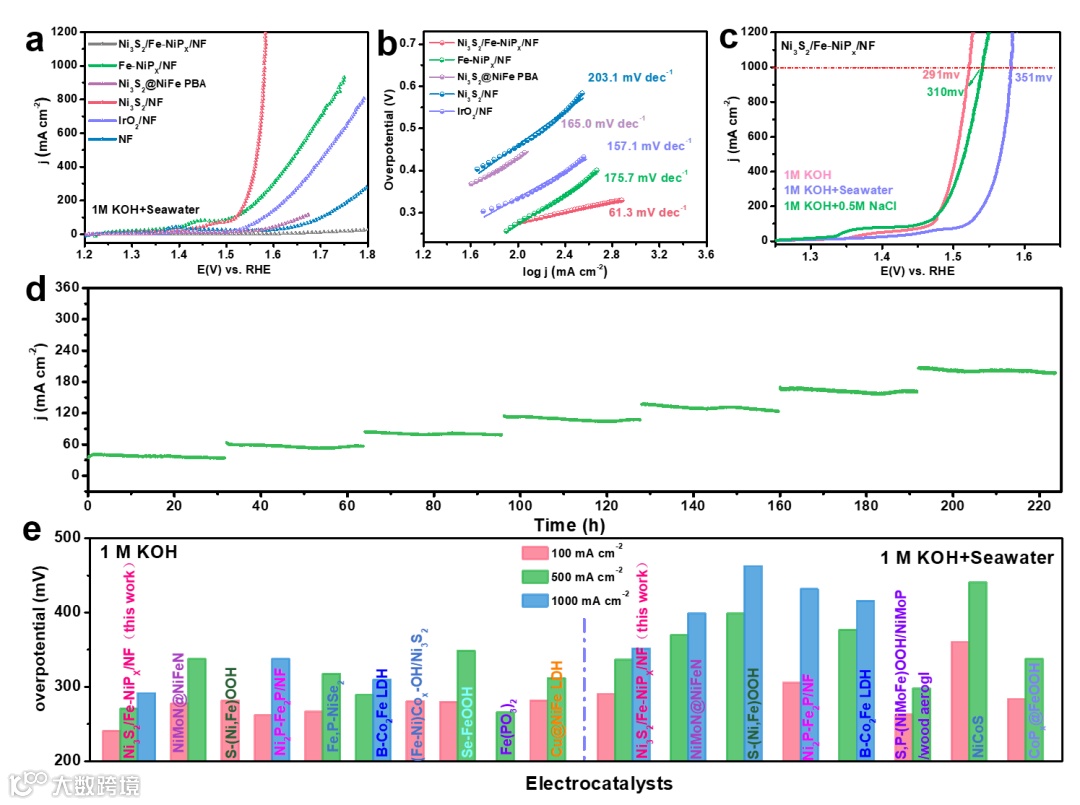结构独特的Ni3S2/Fe-NiPx在碱性介质中具有超高的OER活性和稳定性,其在碱性条件下驱动500和1000 mA cm-2的高电流密度仅需270 和291mV的超低过电位,甚至在碱性海水中达到500和1000 mA cm-2的电流密度也仅需336和351 mV过电位,且同时保持了长达225小时的稳定性。