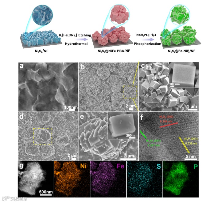 图1. Ni3S2/Fe-NiPx球形结构魔方预催化剂的合成与表征