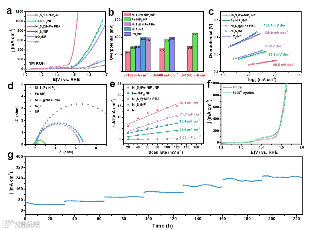 图2. Ni3S2/Fe-NiPx/NF预催化剂在碱性介质中的OER性能