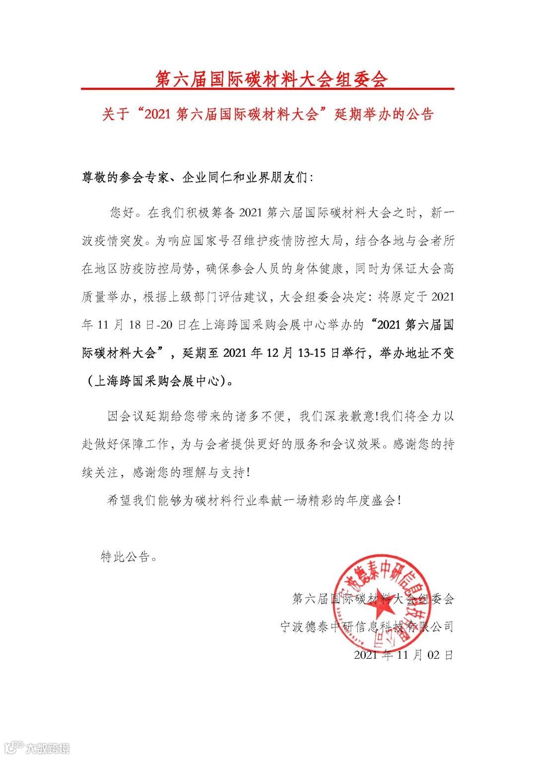疫情影响,原定于2021年11月18-20日在上海举办的“第六届国际碳材料大会”,将延期至2021年12月13-15日举行,举办地址不变(上海跨国采购会展中心)。