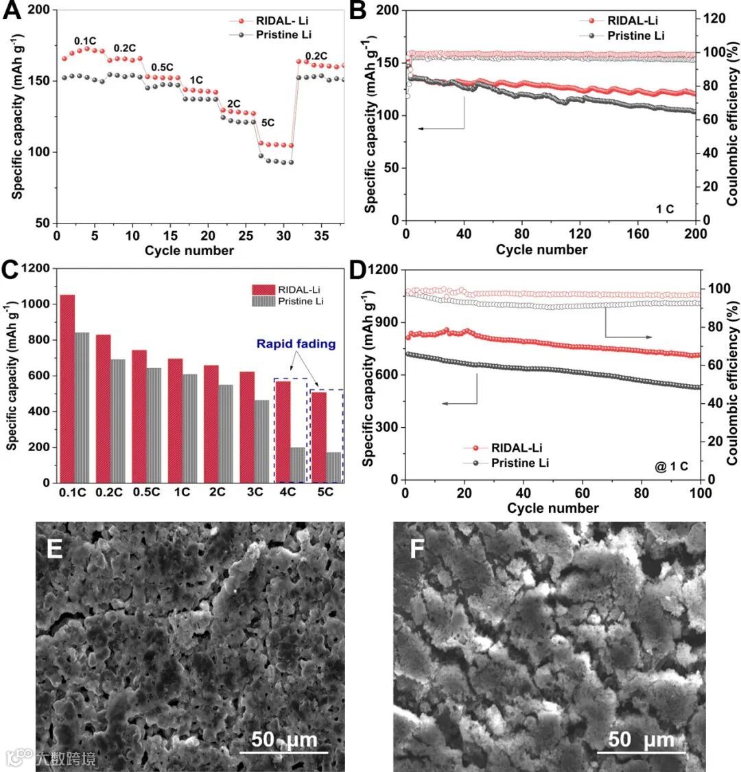 与LiFePO4或硫正极匹配,基于RIDAL-Li组装的全电池稳定性和倍率性能显著提高。由于RIDAL层在电极/电解质界面快速的离子扩散,基于RIDAL-Li的Li-S全电池在高倍率(4C和5C)仍具有高性能,此种方法在未来的商业化具有良好的应用前景。