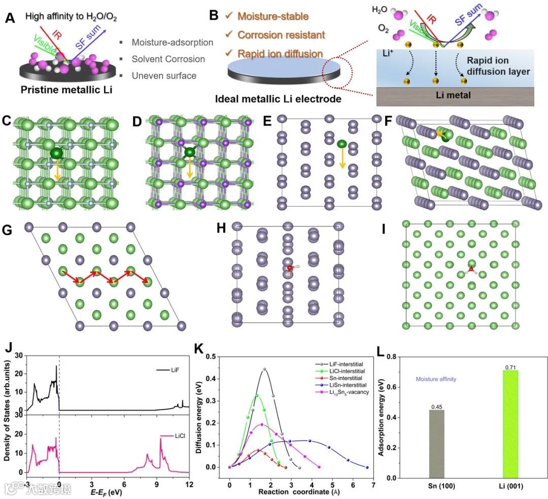 通过Li和液态SnCl4之间的化学反应,在Li箔表面生成了含有微量不溶LiCl的Sn/LixSn合金层。通过简单的化学置换反应制备了快速锂离子扩散合金层(RIDAL-Li),同时具有抗水分和溶剂腐蚀的能力。理论模拟证实,RIDAL层的引入有效地将界面锂离子扩散势垒降低到 0.08 eV,同时使水分到达合金层表面的吸附能降低到0.45eV。
