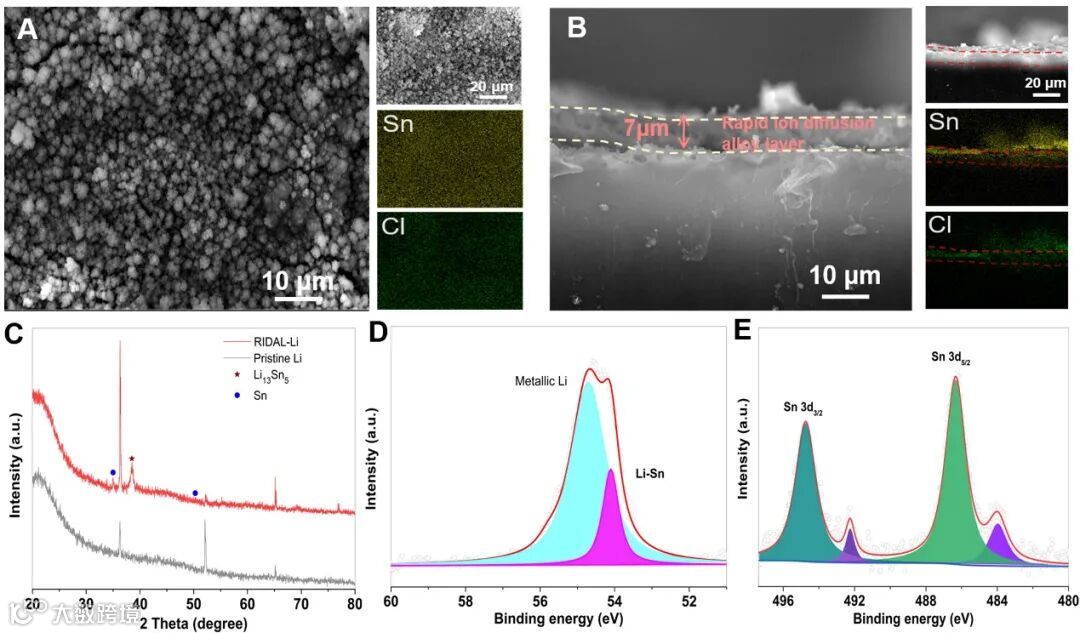 扫描电子显微镜中可以观察到,RIDAL-Li表面有大量均匀分布的纳米颗粒,形成的RIDAL层约为7μm,结合XRD和XPS分析,证实了金属锂的表面Li-Sn合金的生成。