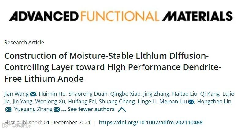 Construction of Moisture-Stable Lithium Diffusion-Controlling Layer toward High Performance Dendrite-Free Lithium Anode Jian Wang, Huimin Hu, Shaorong Duan, Qingbo Xiao, Jing Zhang, Haitao Liu, Qi Kang, Lujie Jia, Jin Yang, Wenlong Xu, Huifang Fei, Shuang Cheng, Linge Li, Meinan Liu, Hongzhen Lin, Yuegang Zhang Advanced Functional Materials 2021, 20210468 DOI: 10.1002/adfm.202110468.