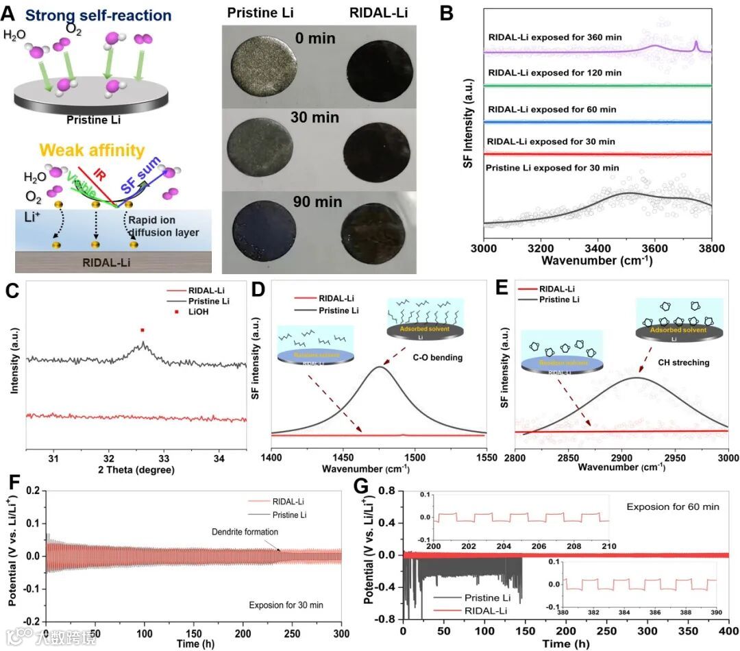 界面和频光谱(SFG)同时也揭示出,制备的RIDAL层还可以耐受电解质溶剂的腐蚀,并显示出对水分的抵抗力。暴露在相对湿度为51%的环境中60分钟,RIDAL-Li也能存活400 h,并表现出18 mV的低过电位,显示出环境气氛下电池组装的优越性。同时对循环后的形貌和结构也进行了表征与机制研究。