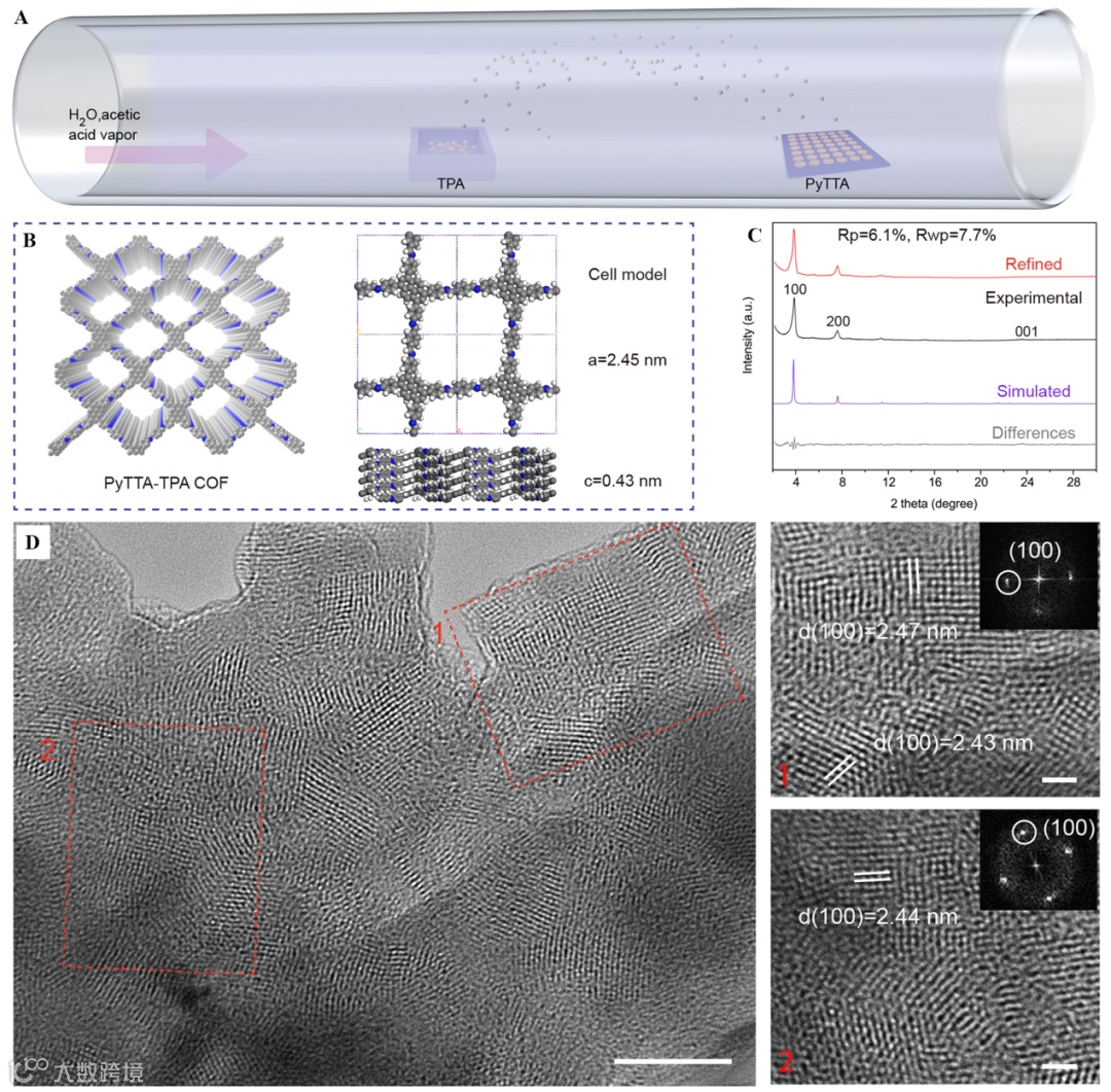 图1 气相诱导薄膜转化方法制备COF薄膜示意图,以及PyTTA-TPA COF的结构表征。