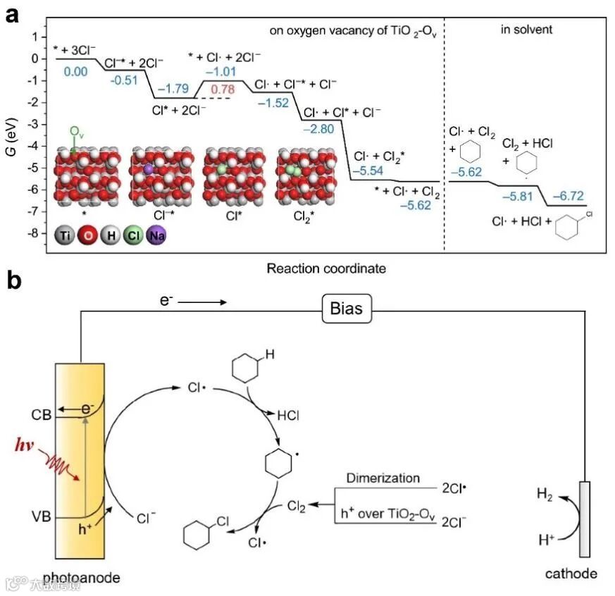 作者进一步通过DFT理论计算对环己烷在TiO2-Ov光阳极上的氯化反应过程和机理进行了解释:i. 在光照条件下,TiO2-Ov光阳极产生的光生空穴(h+)通过单电子转移活化TiO2-Ov吸附的Cl−生成氯自由基(Cl·);ii. 产生的Cl·进攻并活化环己烷上的C−H键,形成环己烷自由基。