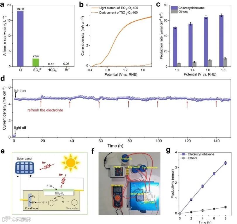 图7. 海水PEC卤化反应及自供能PEC反应系统