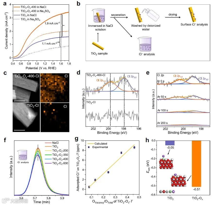 其次,作者通过能量色散X射线能谱(EDS)、X射线光电子能谱(XPS)角分辨X射线光电子能谱(ARXPS)证明了Cl−可以吸附富集在含氧空位的TiO2-Ov-400光阳极表面(图5b-e)。离子色谱(IC)结果表明Cl−吸附量与TiO2表面氧空位浓度呈正相关(图5f,g),说明氧空位对Cl−在催化剂表面的吸附富集起到了至关重要的作用。作者进一步通过DFT理论计算揭示了TiO2表面氧空位对Cl−的吸附能力。