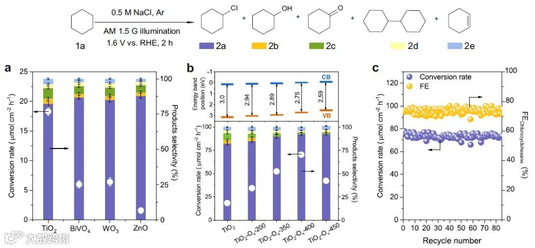 作者首先在FTO导电玻璃上制备了四种常见的TiO2、BiVO4、WO3及ZnO光阳极材料,并以环己烷氯化制氯代环己烷为模型反应对光阳极进行了筛选。结果如图3a所示,在0.5 M NaCl 水溶液以及1.6 V vs. RHE偏压下,TiO2光阳极具有最高的环己烷转化速率(16 µmol cm−2 h−1)和氯代环己烷选择性(> 80%)。