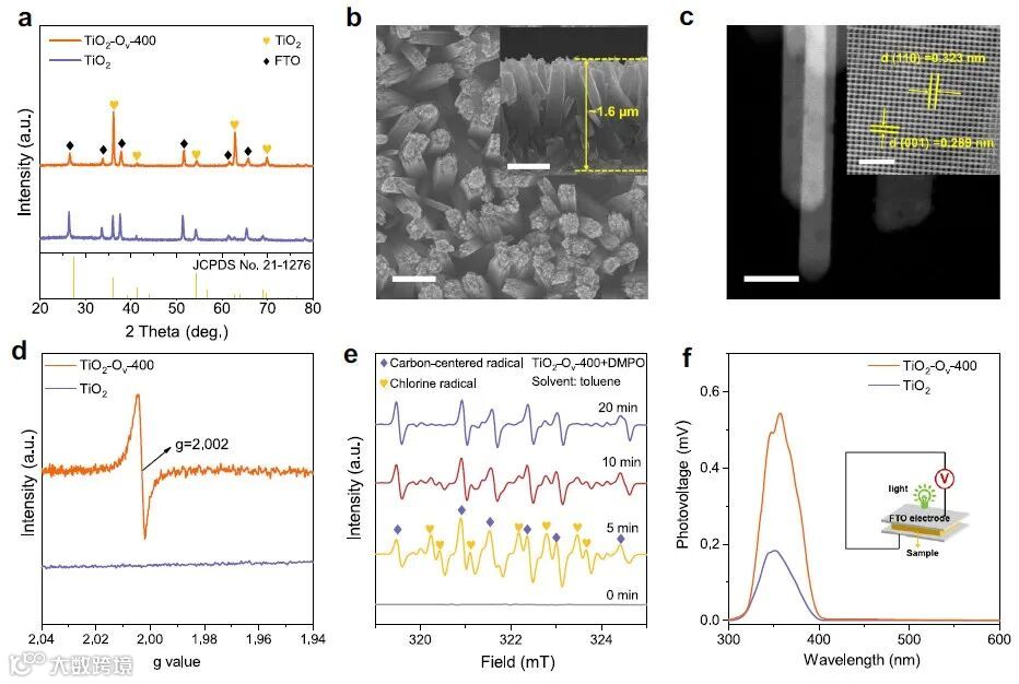 作者通过X射线衍射光谱(XRD)、扫描电子显微镜(SEM)、高角环形暗场像-扫描透射电子显微镜(HAADF-STEM)对TiO2-Ov-400光阳极进行了详细的形貌和结构分析(图4a-c),并通过电子顺磁共振能谱(EPR)证明了氧空位的存在(图4d)。