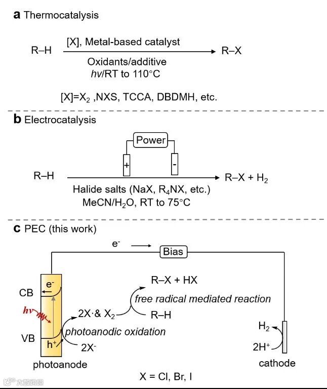 图2. 热催化、电催化、及光电催化卤化反应示意图