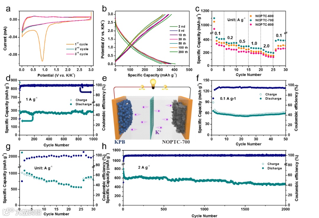 图3. a-f) NOPTC-700的储钾性能。g,h) NOPTC-700的储锂性能。