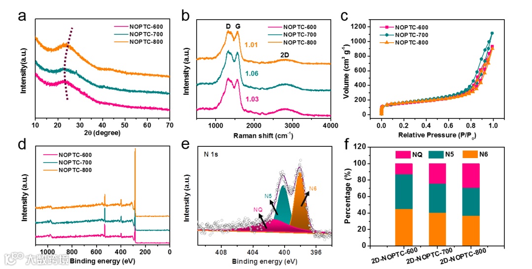通过简单的共聚和炭化方法得到了NOPTC,并通过XRD, Raman, BET 和 XPS等手段表征了三种不同温度下退火得到的样品的共同具备的N/O双掺杂和宽的层间距的碳结构。