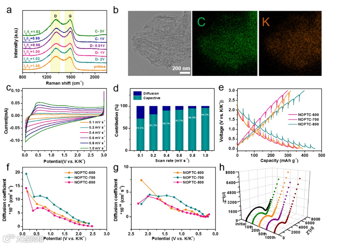 使用非原位Raman技术揭示了NOPTC-700在钾离子嵌入/脱出过程中的结构演变。结合不同扫描速度下的CV曲线以及GITT和EIS测试结果显示,NOPTC-700具有高赝电容贡献率和更大的钾离子扩散系数,有利于钾离子扩散动力学的改善。