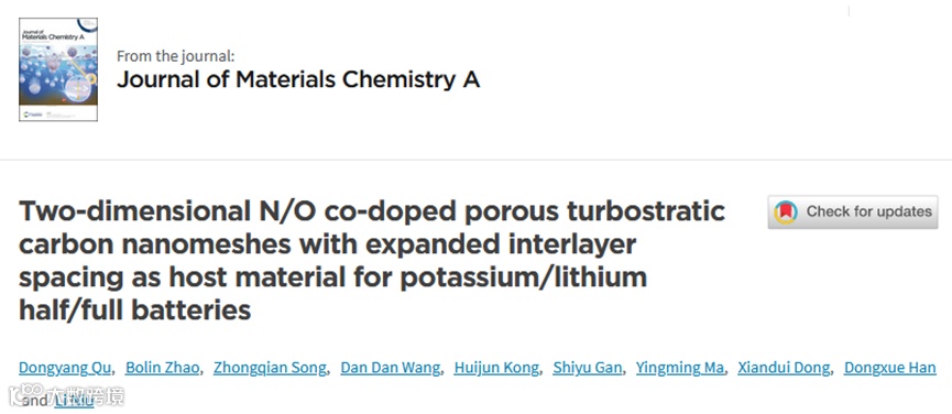 在这里,来自广州大学的牛利教授与韩冬雪教授合作,在国际知名期刊Journal of Materials Chemistry A上发表题为“Two-dimensional N/O co-doped porous turbostratic carbon nanomeshes with expanded interlayer spacing as host material for potassium/lithium half/full batteries”的研究论文。