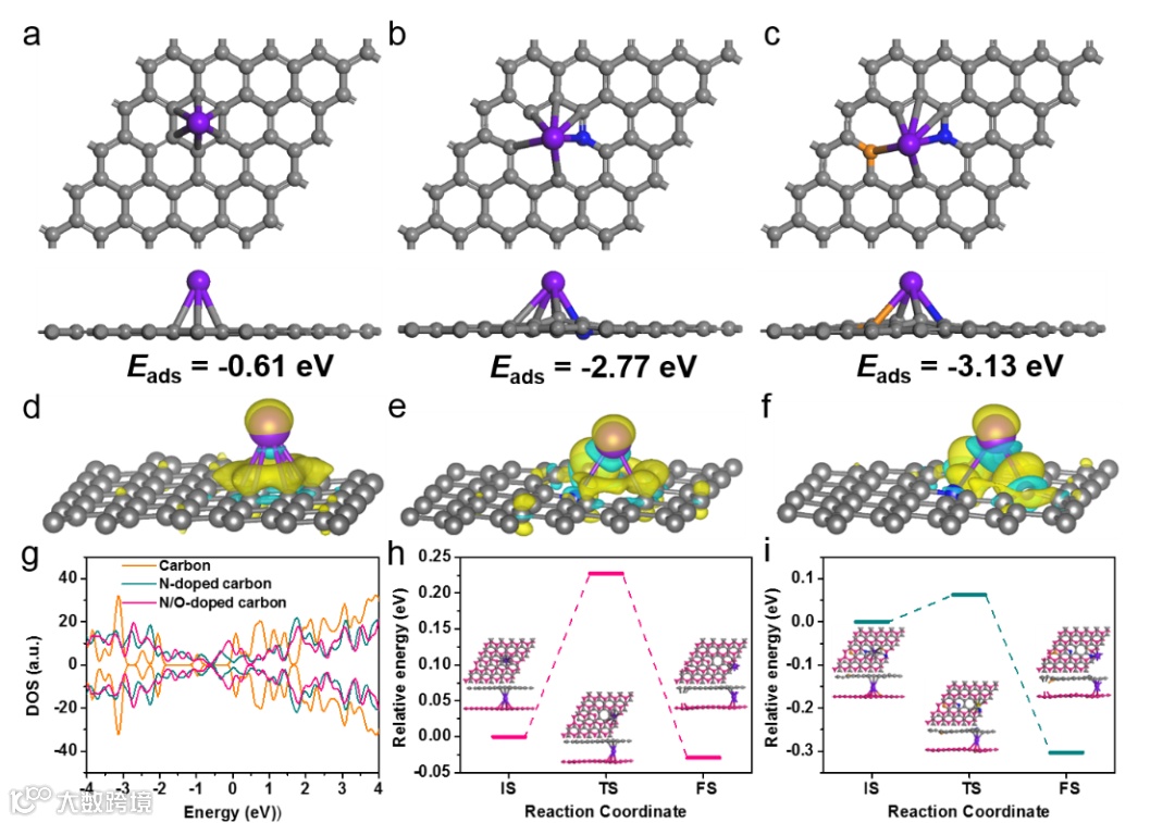 使用DFT计算从理论上揭示了N/O共掺杂对K离子存储的影响。通过三种不同的碳几何模型的吸附能,电子差分密度,电子态密度和扩散势垒的对比,证实了N/O共掺杂策略可以调节碳原子的电子结构,促进K离子的吸附和扩散,从而提高NOPTC的电化学性能。
