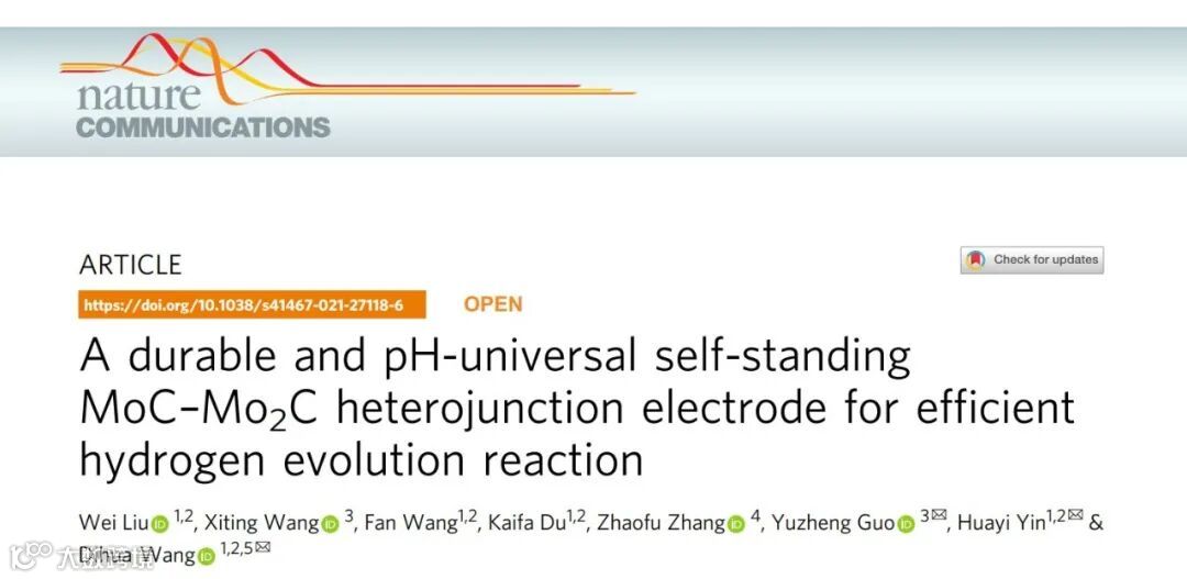 基于此,武汉大学资源与环境科学学院汪的华、尹华意教授课题组与电气与电动化学院郭宇铮教授课题组联合在国际期刊Nature Communications(《自然▪通讯》)在线发表题目为“A durable and pH-universal self-standing MoC-Mo2C heterojunction electrode for efficient hydrogen evolution reaction”的文章。该工作提供了一种可用于酸/碱体系的长寿命高性能MoC-Mo2C异质结析氢电极。