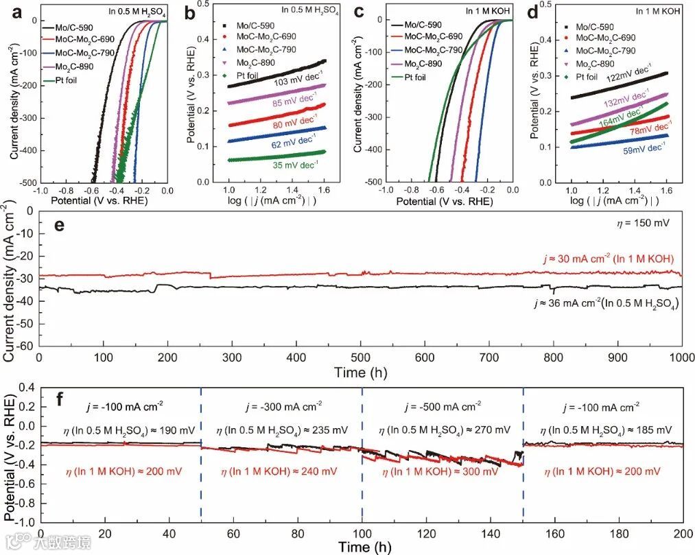 图2. a-d为不同电极在酸、碱电解液中的析氢极化曲线(MoC-Mo2C异质结电极在酸碱中表现出相近的Tafel斜率);e-f为MoC-Mo2C异质结析氢电极在酸、碱中工作稳定性测试曲线